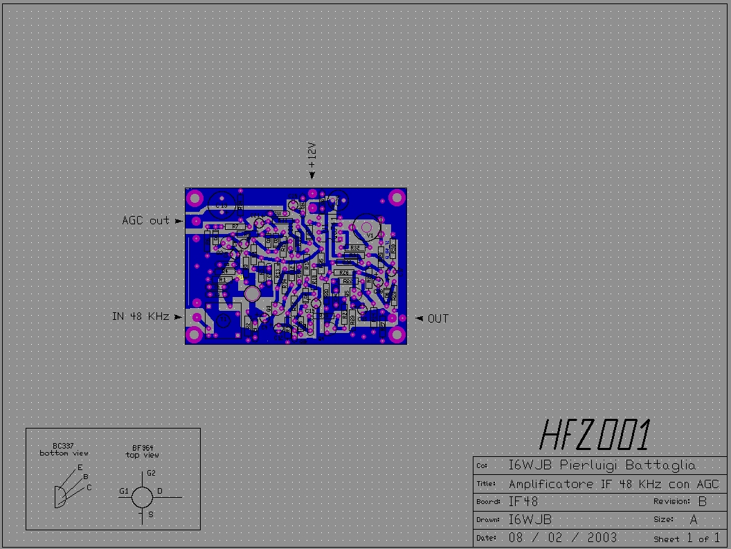 Questo amplificatore è realizzato utilizzando un solo BF981, Mosfet dual-gate a basso rumore, che permette di ottenere 26 dB di guadagno alla frequenza di 45 MHz con una figura di rumore che non supera 1 dB.