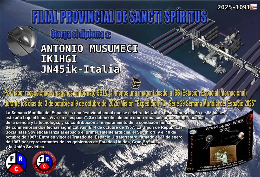Missione "Expedition73 - ARISS Serie 27"Frequenza: 145.800 MHz. Modalità SSTV: PD120. DATA: DAL 5 AL 12 maggio 2025. La Sezione di Sancti Spíritus ringraziarvi per la vostra partecipazione e ti rilasciamo questo diploma come prova di ricezione per la sua parte di immagini SSTV dalla ISS, grazie della vostra collaborazione 73 ik1hgi Tony |