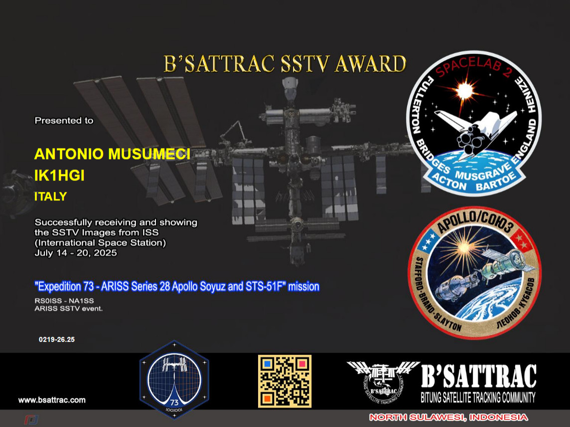 Ham Satellite PR SSTV on ISS 2024-2025 https://www.bsattrac.com/award "Expedition 72 - Series 22 Fortieth Anniversary" mission. Aprile 16-11- 2025 |