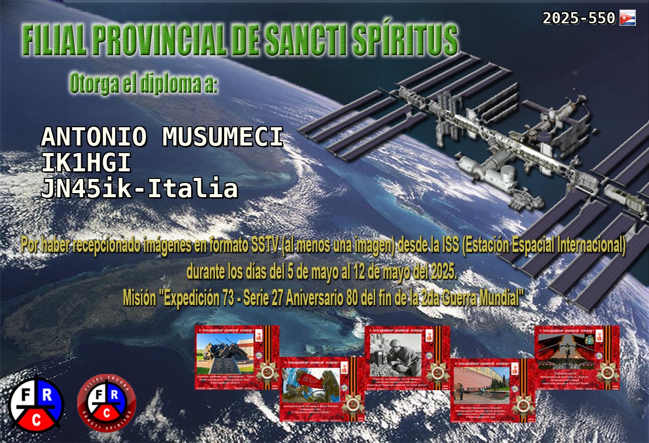 Missione "Expedition 73"Expedition 73 - ARISS Series 28Apollo Soyuz and STS-51F"La Filial Provincial de Sancti Spíritus quiere agradecerle su participación y otorgarle este diploma como constancia de la recepción por su parte de imágenes SSTV desde la ISS, motivo "Expedición 73 - Serie 28 Apolo Soyuz y STS-51F https://drive.google.com/drive/ |