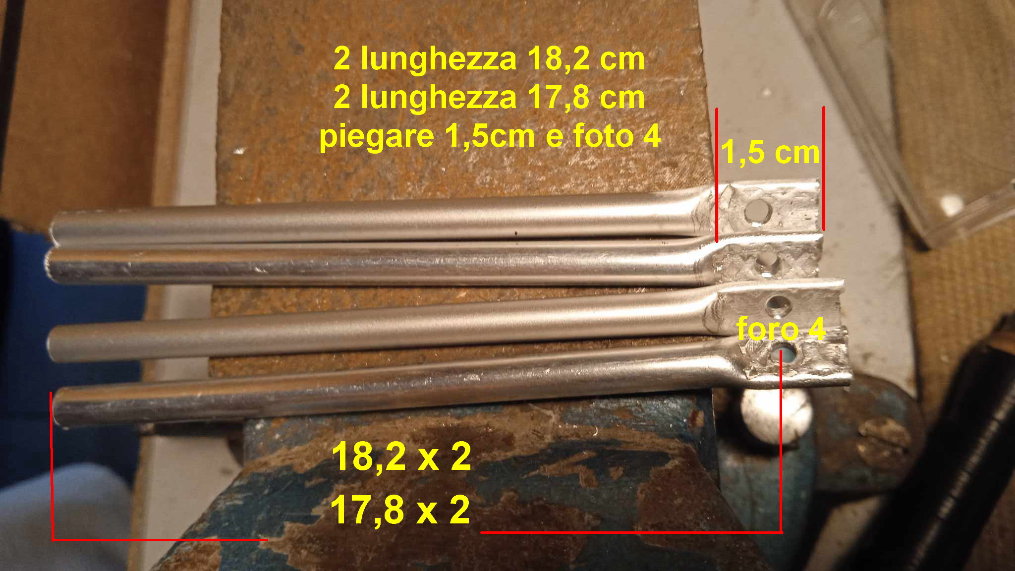 Tagliare il tubo di alluminio 2 da 18,2 altri due da 17,8 cm piegare come foto tutte 4 pezzi, in morsa come foto a 1,5 cm, forare con punta del 3 al centro secondo le vostre esigenti anche con la punta del 4 |