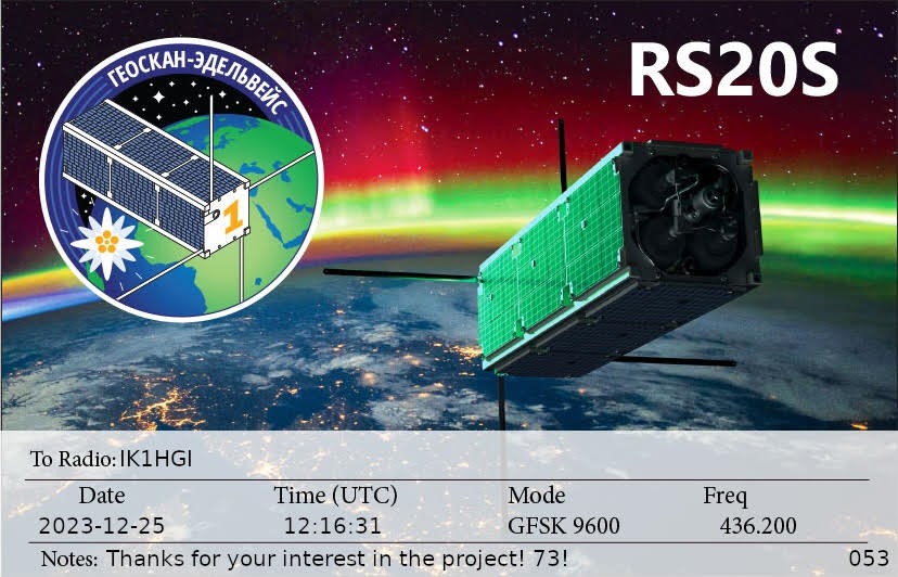 disegnate dagli studenti della scuola primaria. Ricevuto la SSTV 17 marzo 2024 ore 09:14,22 UTC Ricevuto solo la telemetria il modo sstv era ultimo passaggio poco ____________________________________________________________________________________________ UMKA-1 ricevuto in data la telemetri 03-03-2024 20:35 UTC Ecco la qsl del gruppo UMKA-1 RS40S Ciao, Antonio! A nome del team del progetto School Space Telescope, mi congratulo con voi per la riuscita ricezione della telemetria, il nostro telescopio satellitare UMKA -1 ed esprimo la mia gratitudine per l'interesse mostrato nel progetto. In segno di apprezzamento e come conferma di aver ricevuto la telemetria, ti invio una cartolina QSL. ______________________________________________________________________________________ Per questo satellite rispettare la frequenza per ascolto
