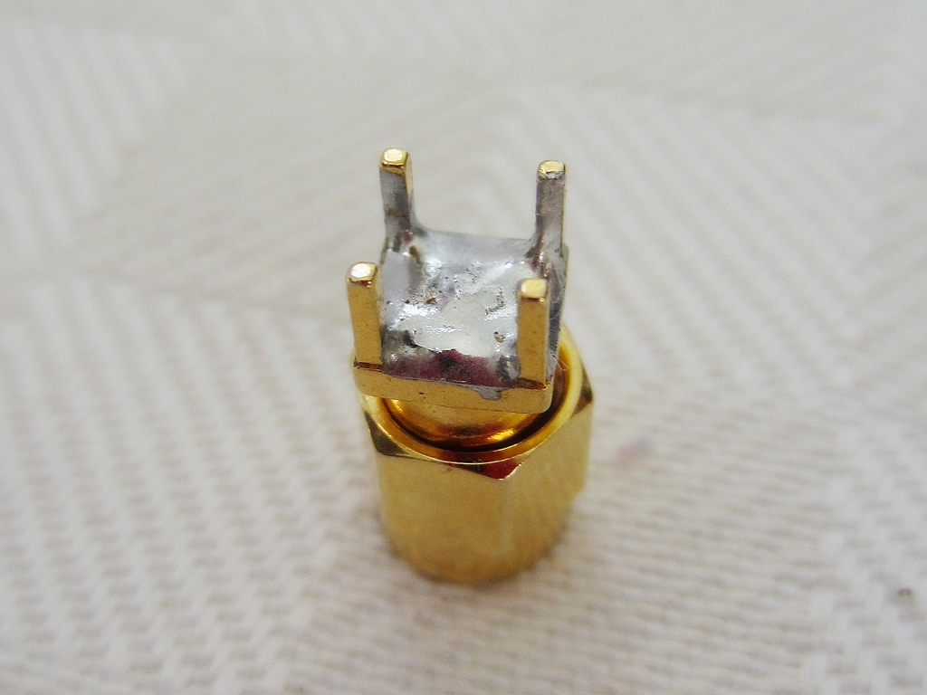 A connector shorted on the back with a small copper disk cut out from thin copper tape; the copper disk just filled the void between the center conductor and the surrounding ground and was then covered with tin-lead solder.