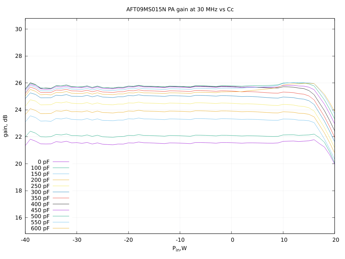 The PA gain at 30 MHz initially increase with increasing values of the compensation capacitance but starts to decrease after reaching a good flatness with a capacitance of about 400 pF: