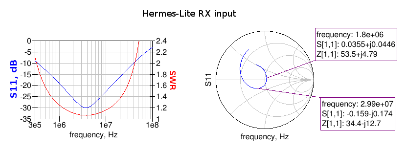 Optionally this board can also include a filter for the RX path, useful for experimenting with various options before fixing the final design. The response of a (passive) filter depends on the source and termination impedances, so it make sense to check whether the impedance seen at the RX transformer is close to the design 50 Ω.