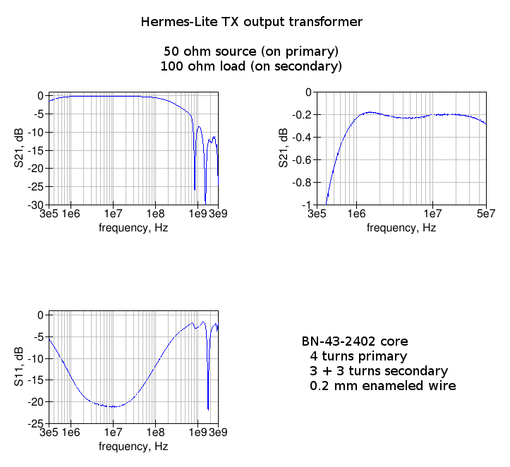 In this configuration the transformer has a response extending from less than 300 kHz to about 150 MHz; in the HF band the losses are around 0.1 dB (see second graph above).