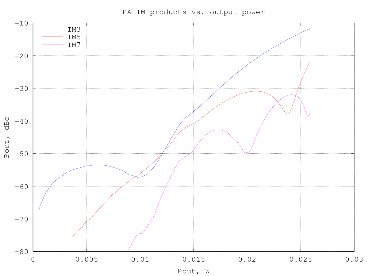 The third-order intermodulation products amplitude w.r.t the output power per-tone is shown in the graph below (to obtain the actual [average] output power multiply the value by two, to have the PEP, multiply by 4):