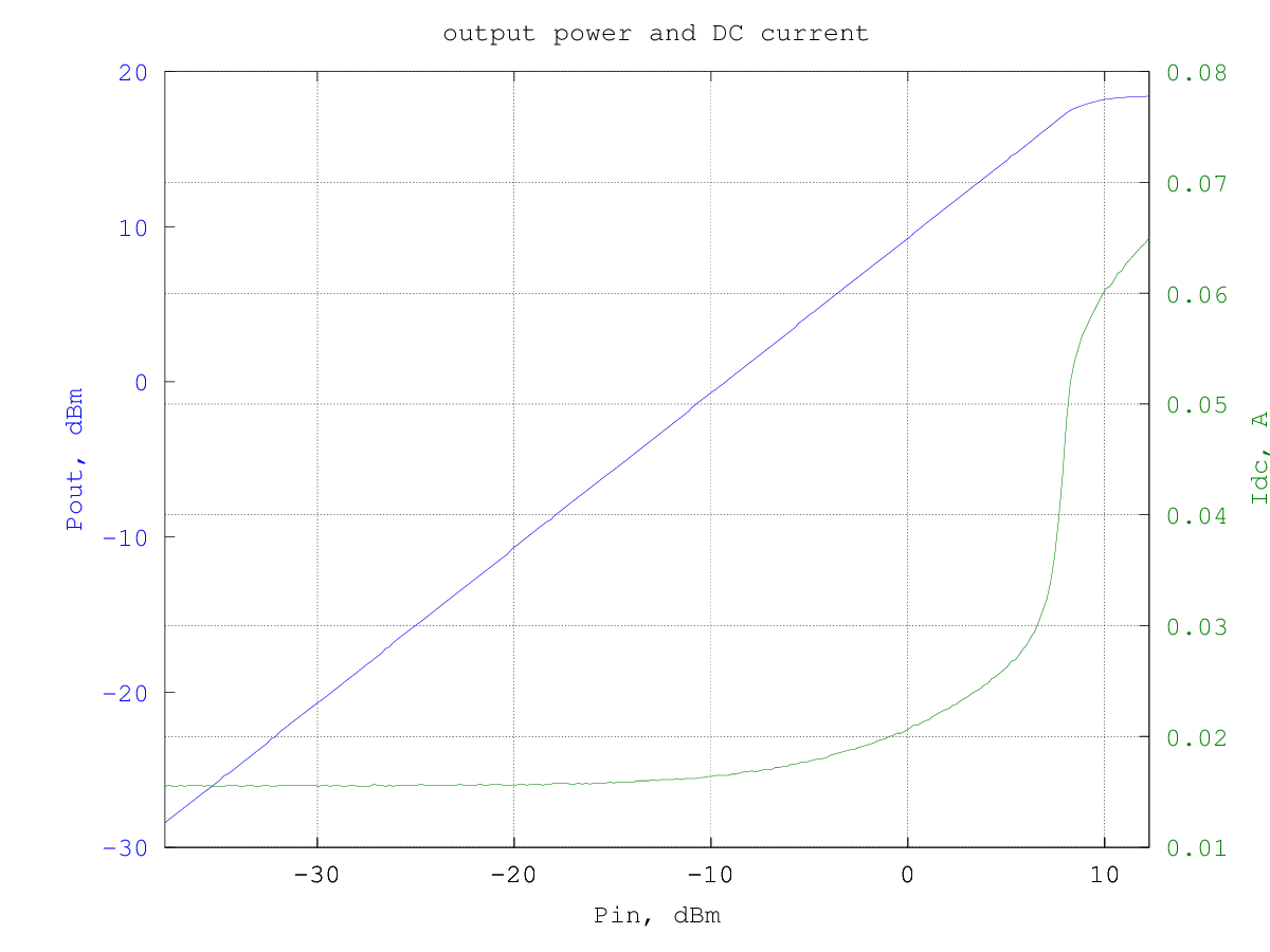 the output power at 1 dB of compression is about 66 mW (18.2 dBm).