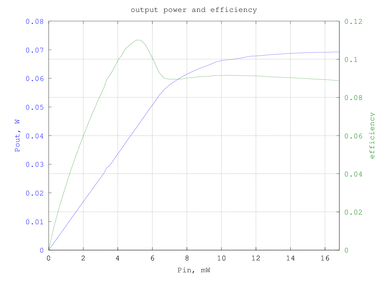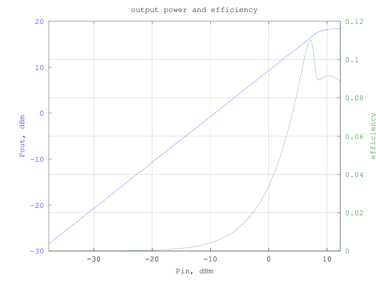 and the resulting efficiency is shown in the graphs below (data are the same for the two graphs, in the first the input and output power are in dBm and in the second they are in watt):