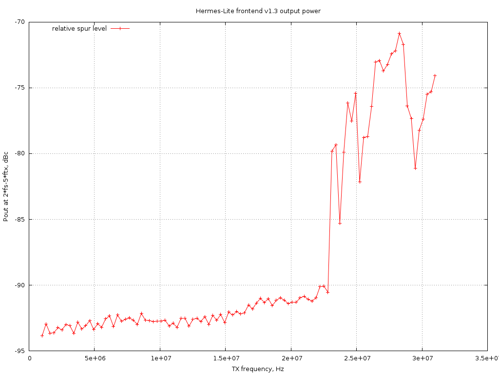The harmonics shown below are generated by the frontend: the ones from the AD9866 TxDAC are filtered out by the frontend filter (above 30 MHz).