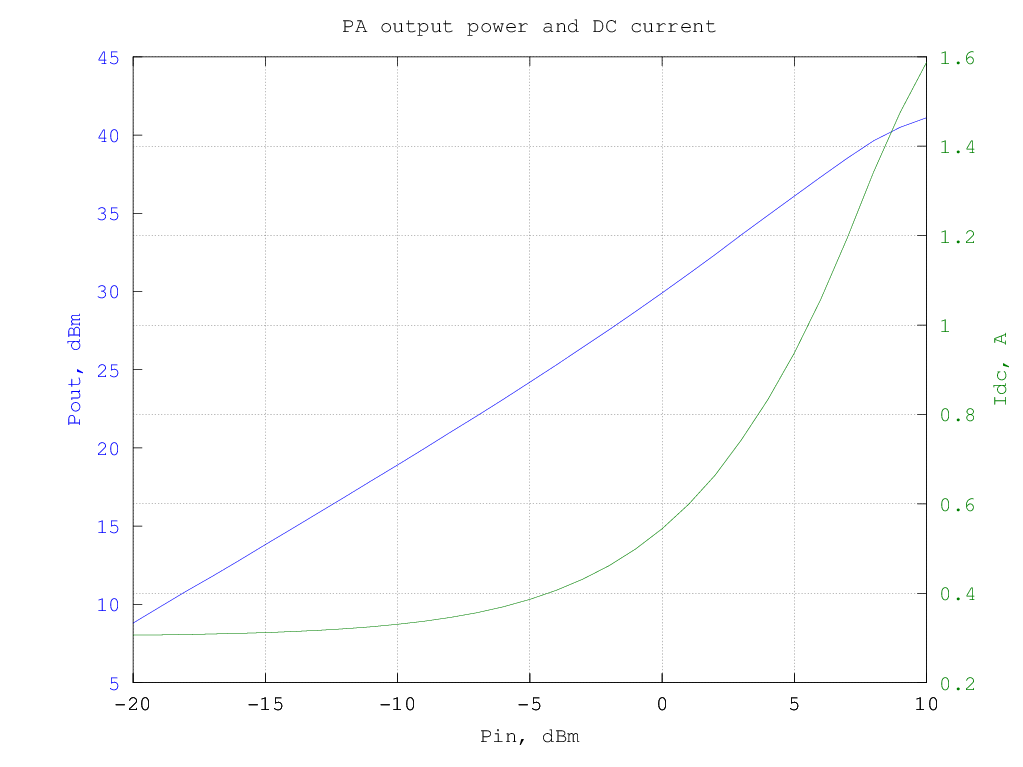 The data above are summarized in the following picture; all data were measured with -30 dBm at the PA input (i.e. approximately 0 dBm output):