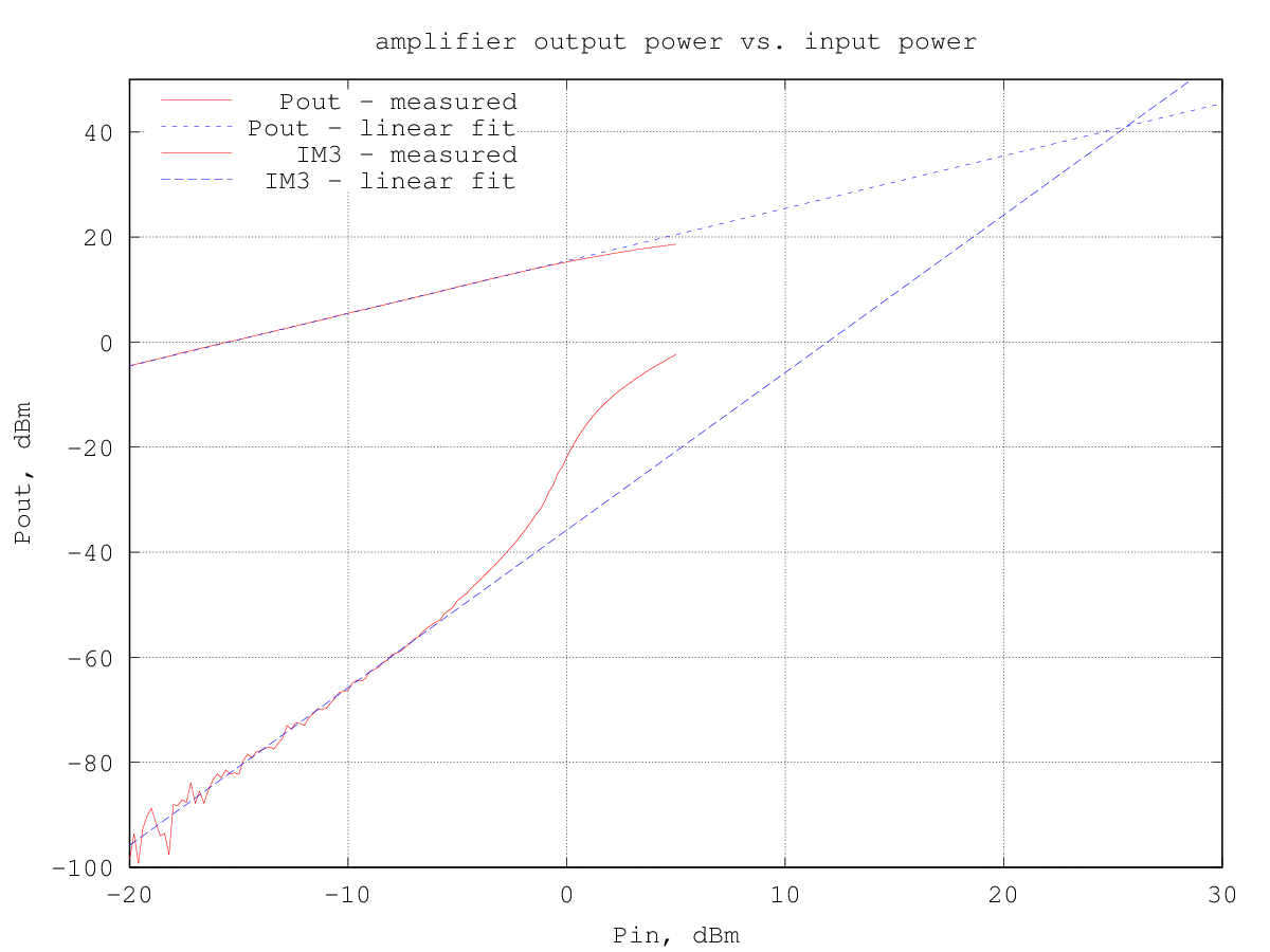 By plotting the third-order intermodulation products power vs. the input power we can find the intercept point by extrapolating the results. The amplifier third-order intermodulation products follow the theoretical 3:1 slope w.r.t. the input power up to about -5 dBm input, as can be seen from the graph below: