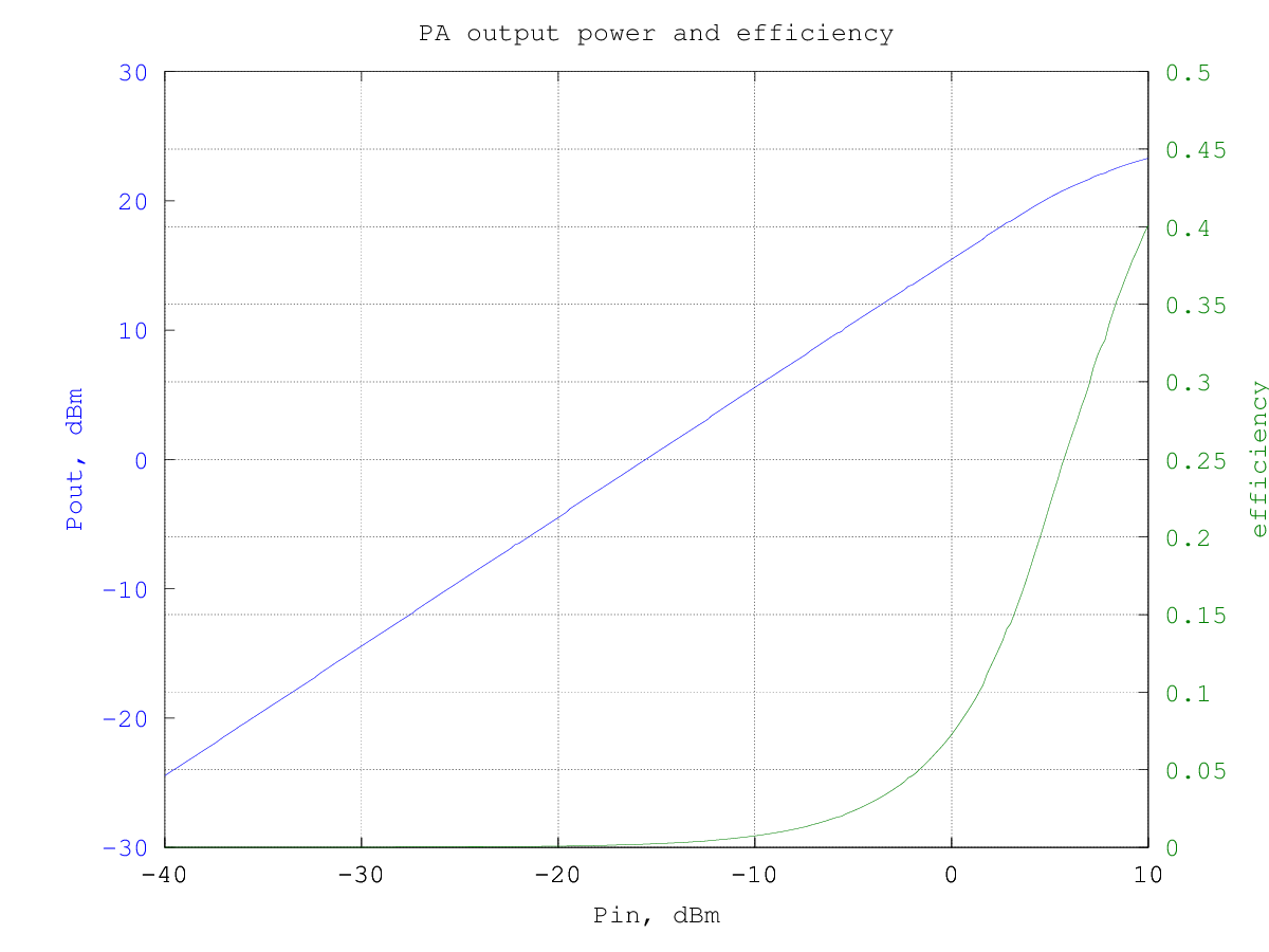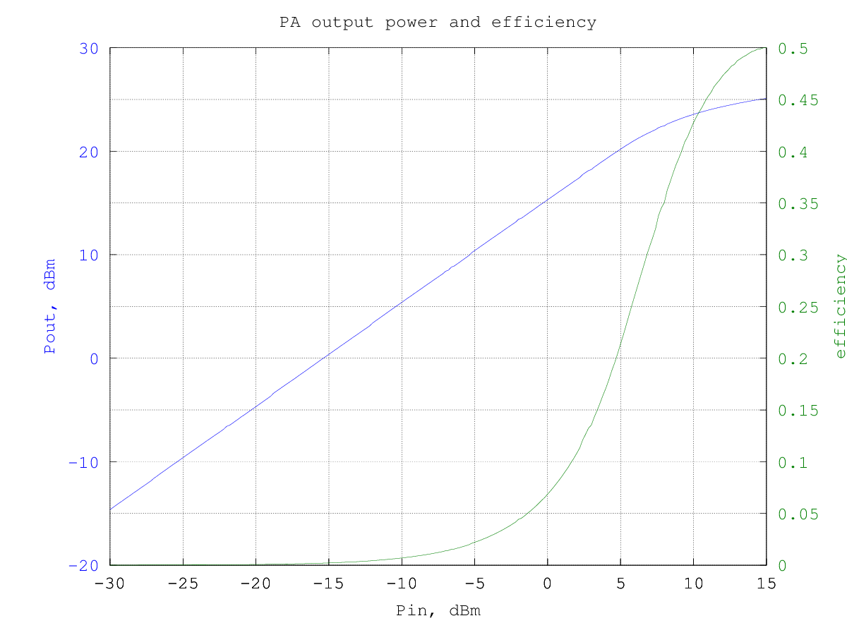 and the resulting efficiency is shown in the graphs below (data are the same for the two graphs, in the first the input and output power are in dBm and in the second they are in watt):