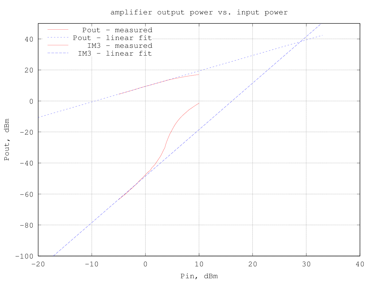 By plotting the third-order intermodulation products power vs. the input power we can find the intercept point by extrapolating the results. The amplifier third-order intermodulation products follow the theoretical 3:1 slope w.r.t. the input power up to about 1 dBm input, as can be seen from the graph below: