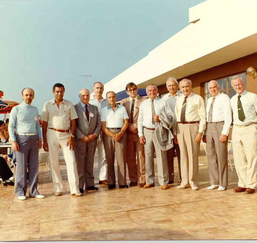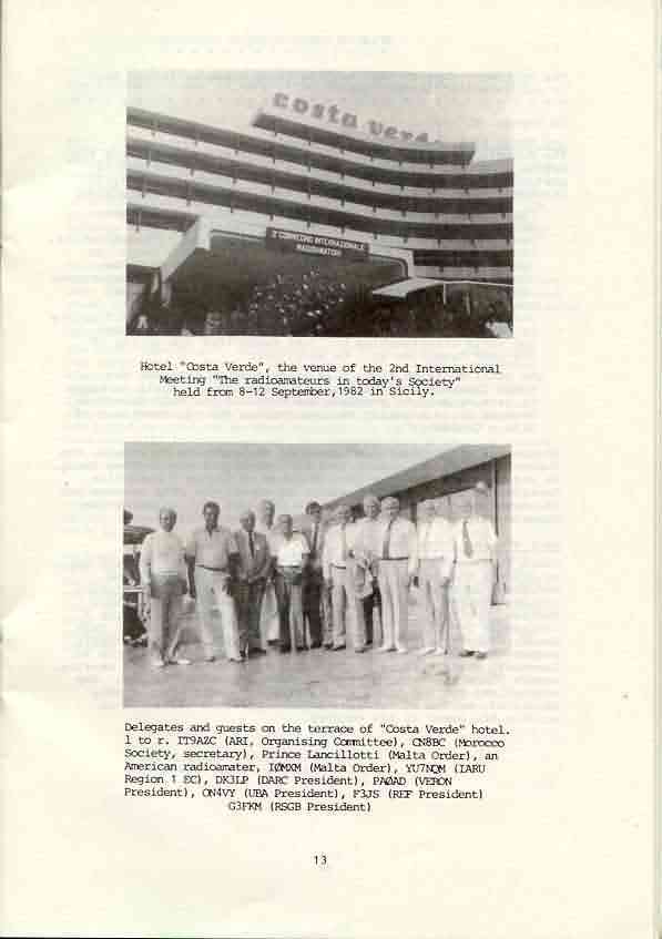 Cefalù 1982: foto ricordo dei delegati internazionali. Da sinistra, dopo IT9AZS, si notano CN8BC (Segretario dell'Associazione del Marocco), il principe Lancellotti (Ordine di Malta), I0MXM (Ordine di Malta), YU7NQM (Comitato Esecutivo IARU Reg.1), DK3LP (Presidente della DARC), PA0AD (Presidente del VERON), ON4VY (Presidente dell'UBA), F3JS (Presidente del REF), G3FKM (Presidente RSGB)