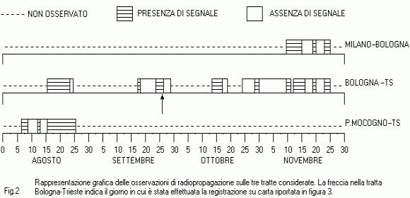 In figura 2 sono stati riassunti i risultati ottenuti sulle due tratte in esame. Le zone tratteggiate si riferiscono ai periodi in cui non sono state fatte osservazioni; quelle incasellate e vuote ai giorni di assenza del segnale, mentre quelle incasellate e riempite con tratto continuo ai giorni in cui è stato ricevuto il segnale almeno per alcune ore. La classificazione è quindi per eventi favorevoli o sfavorevoli giornalieri in quanto le osservazioni non sono state rigorosamente continuative. Pertanto non si escludono brevi periodi di evanescenza profonda verificatesi durante gli eventi considerati positivi e viceversa brevi periodi di presenza del segnale in quelli considerati negativi.