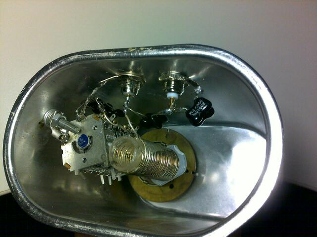 are still in the original chassis). A plastic container for storing cheese in the fridge has been sacrified for the additional box; the shielding has been obtained by squeezing a single-use aluminium baking tin into the container. Click on the pic for enlarging. |