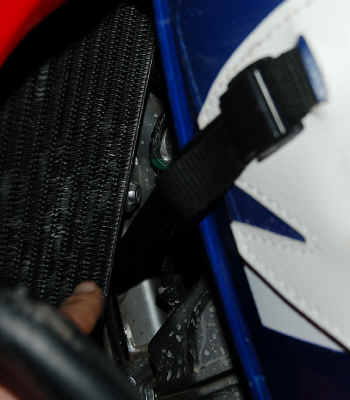 Ne ho richiesto un paio di ricambio alla Bagster ma non avendo avuto risposta ho provveduto diversamente; benche' di facile realizzazione (un pezzo di plastica con una piega a V per fissarsi alle nervature del serbatoio) ho pensato ad una soluzione tanto semplice quanto stupida: una cinghietta che invece di fissarsi al serbatoio passa sotto questo e collega fra di loro i due punti;