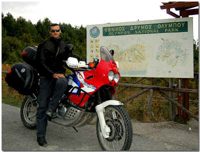 Esco a Plaka e poi la strada sale sempre verso Litohoro; da qui seguo le indicazioni per il Monte Olimpo; c'è un piccolo ceck-in sull'unica strada per salire ,forse per questioni di sicurezza: il monte e' abbastanza alto e vasto e le autorita' vogliono assicurarsi che chi ci sale fa ritorno; salendo il cielo si fa sempre più nero e la temperatura cala sempre più. Ad un certo punto un cartello indica una deviazione per il monastero di Agia Dionissios. E' una strada sterrata senza difficoltà con tornanti a U molto in discesa,ma se dovesse piovere si formerebbe fango e rimarrei bloccato;
