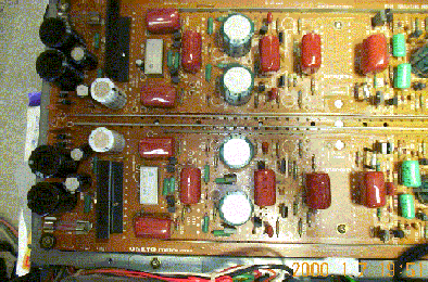 右から、MCアンプ、RIAA(MM)アンプで、上下が左右です。真中にアースラインの鉄板が通っています。25年前のものとは思えない美しさ、これを「捨てろ」とは、誰も言わないでしょう。 |