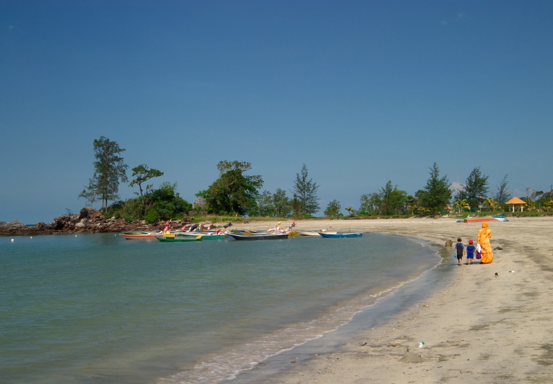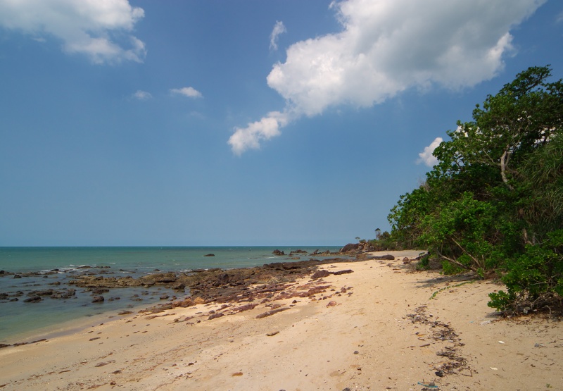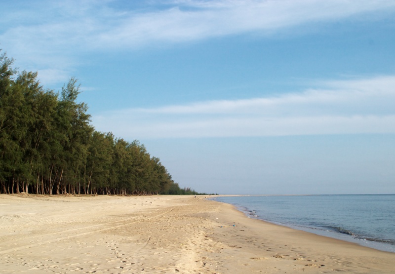 3月の終わり頃から9月までの約半年間はモンスーン(季節風)が吹かず、雨が少なく、いわゆる乾期にあたります。この時期の東海岸は波がおだやかで、青い海とどこまでも続く白い砂浜を十二分に堪能できます。南半分のジョホール州の海岸しか踏破していませんが、広大な景色を独り占めできるような場所がたくさんありました。(クリックすると拡大できます。)