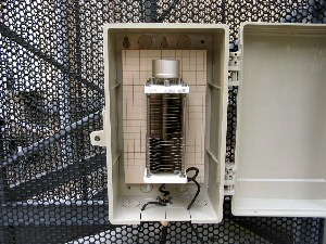 下の部分 シャント線をピンと張るために、碍子の下にはステンレスのバネを付けて、ブロックの小さなものを地面に置き固定しています。ブロックを移動させて、タワーとシャント線との距離を調節することによりSWRの調整が可能です。 |