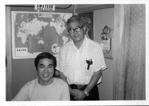 | 私の局で野瀬さんと私のツーショットです | 私の無線局に座っている野瀬さん、KH6IJ特製のパイナップル缶詰 をお土産にくれました(無線機の前にある白い缶) |