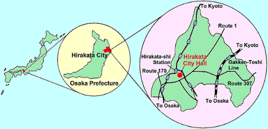 Hirakata is located in the North Eastern part of Osaka Prefecture between the two major cities of the Kansai Region, Kyoto and Osaka. Kyoto is 27 kms to the Northeast and Osaka is 21 kms to the Southwest.