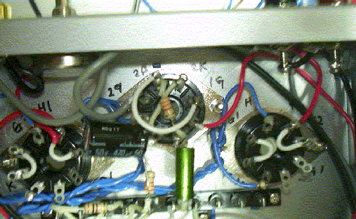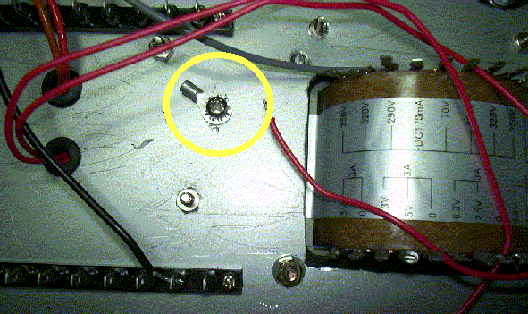 アースのひとつめのポイントが上記の黄色い○です。ここは、トランスの0V、ヒータの片側、C電源整流コンデンサーのマイナス側、前段のアース母線を、支線を作らず最短距離で一点アースします。必然的にケースの中央になります。シャーシ側と、たまごラグに歯が食い込むように2枚の菊ワッシャを入れます。