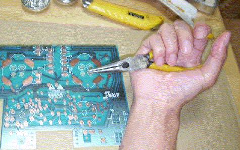TU-898や、TU-874と違い、ホールより太目のピンを立てるため、上記のようにラジオペンチでしっかりつまんで、下のように、力づくで刺します。ひっくり返しても抜けないので、こっちのほうがハンダ付けは楽です。