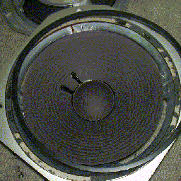 ひととおり貼り終わったら、コーンを押し込んで、ボイスコイルに「あたり」がないか確認します。「あたる」ようだったら、少しぐりぐりして自由度を与えます。そうすると、当然糊がついていなかったところが右上の写真のようにハミ出ます。そこに糊をつけて押し込みます。 ![]()