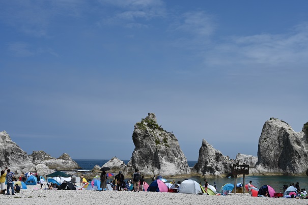 三陸の海岸は奇麗ですが、ここはその頂点といった感じ。 海水浴場でもあるので人が多かったですが、それでもたいした混雑でないところが東北の良いところです。 |