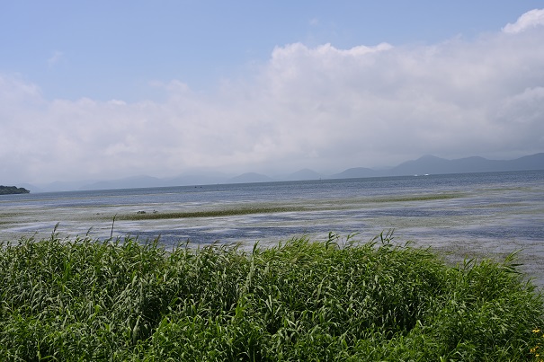 夏に来たら、びっくりするほど明るい。 しんみりした雰囲気の猪苗代湖しかしらなかったので、別のところへ来たのかとおもいました。 湖水浴のできる砂浜もありました。 |