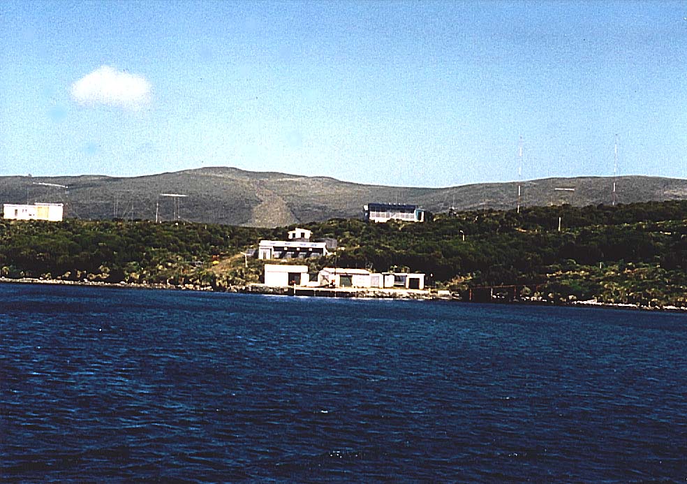 ZL9CI site from the boat. Shack at center on the hill. SSB antennas on right, as CW antennas on left