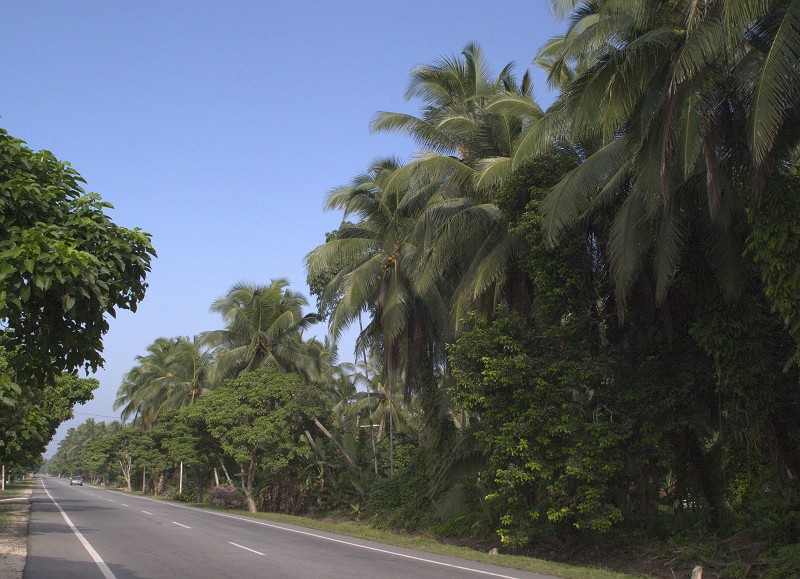 高床式の典型的なマレー式住宅も多く見られます。この道の制限速度は90Kmですが、みんな100Km超え位の猛スピードで飛ばしています。こっちは景色を楽しみながらですので80Km、仕方ないので車が追いついて来たら、止まって行かせてやりました。 |