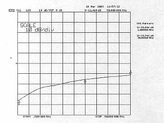 I searched the net in hopes of finding remote coax switch construction details. There wasn't much, I suppose there aren't many hams that have built them. There was a nice page that inspired me to give it a try. Specifically it gave details on how to make DC relays more suitable for switching RF by soldering a strap across two wipers, which shortens the path the signal has to go through. It just so happens I have a box of several dozen identical 4PDT Omron relays which would save me a lot of money over having to buy all new relays for this project (I need a total of 24). To test it out, I modified one relay and soldered coax to it's terminals, then connected it to an HP8753E network analyzer to see how it perform over frequency. Below is a plot of the results: