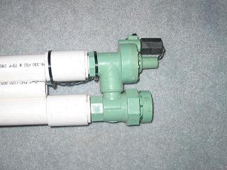 Now, the two pipes will be pretty unstable just screwed into the valve, so I used some 1" PVC to serve as a rib between the two. It makes the entire assemby sturdy and parallel, as well as provides a place to run the valve wiring.