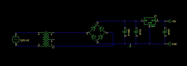 Besides the 7805, I use two 100nF ceramic capacitors and a 1500uF electrolytic (which provides the initial smoothing of the rectified output). The bridge rectifier was one I bought from Radio Shack some number of years ago and either the 12V or 6.3V output of the power transformer will work.
