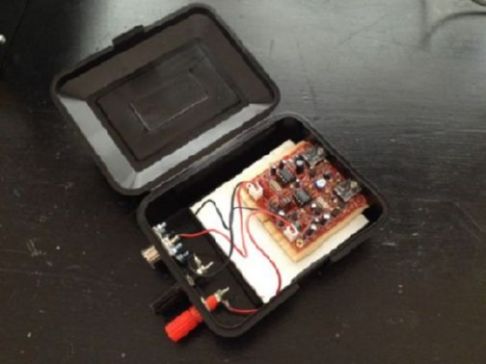 Cased in chinese tea tin box. Puts out about 100 mW on 9 volts."