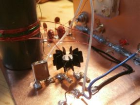 by Jim. He reports that it was "built using 2n2222a transistor and coil wound on pill bottle.