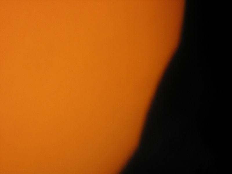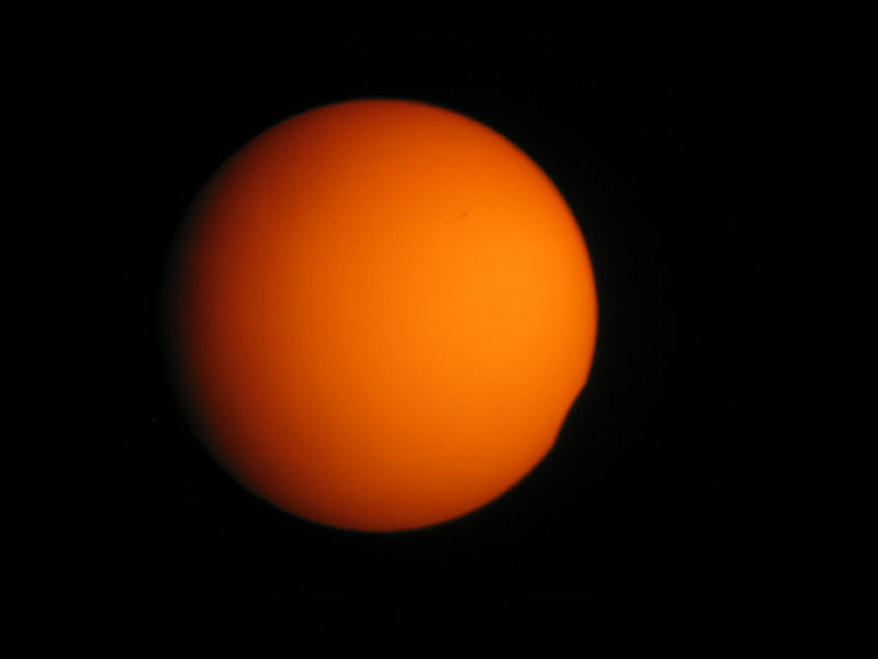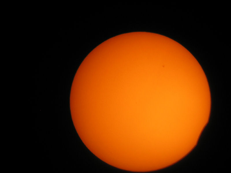 | This is a view that I rotated and mirrored to show how Venus would appear w/o a refracting telescope. The left edge is the edge of my eyepiece and the right edge is the edge of the sun. Time: 5:55 a.m. CDT 6/8/04. | A black and white close-up version of the previous picture. | Venus Transit. Time: 5:55 a.m. CDT 6/8/04. |