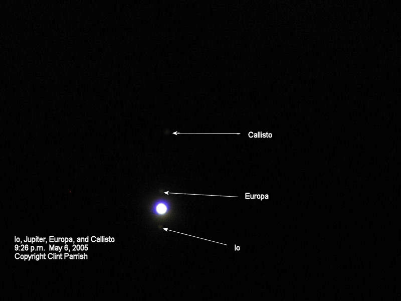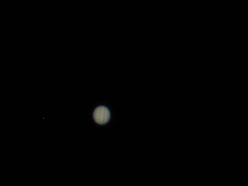 | On May 6 I photographed Jupiter and Saturn. This is Jupiter. Visible are the northern and southern cloud bands. | Jupiter and three of its moons. | Saturn in all its glory! |