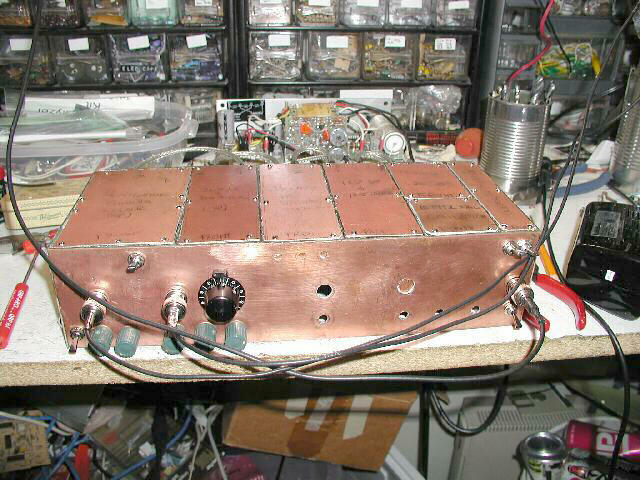 In this photo, the RF chain has been completed as well as the 20dB attenuator. Note that I originally was going to have the input just to the left of the Tracking Generator (the two holes dead center are where the TG goes). I decided to move it to the far side (right in this photo, but actually on the far left, when turned right side up). I took a piece of copper foil and soldered it to the inside of the 10dB pad enclosure and then covered it with a label...