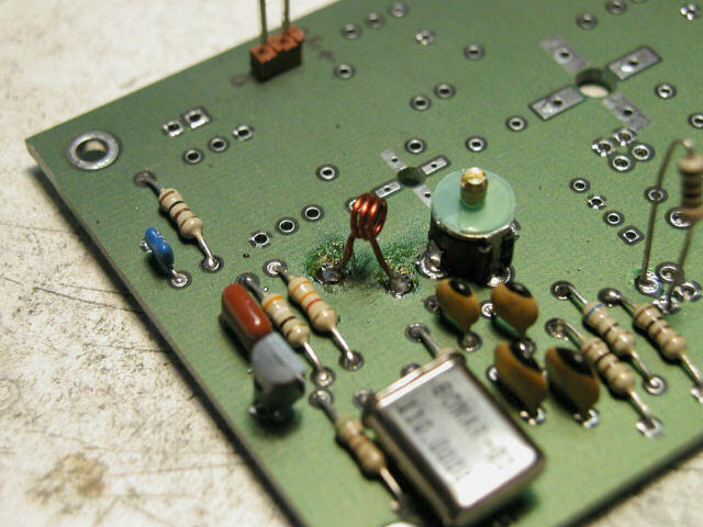 This is a close up of the LO coil, L1. It is supposed to be 22nH (a very tiny inductance!), constructed by winding "2 1/2 turns of #22 wire on a 6-32 screw." Well, by looking at a somewhat out of focus picture, I realized that I had counted the turns wrong and had wound 3 1/2 turns on my coil. A new coil later, and I had oscillation.