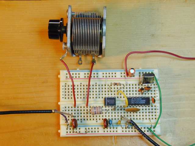 The receiver, like its up-converter predecessor, was built on a solderless protoboard. In the future I may revise the circuit to use varactor tuning with an MVAM109 or NTE618 diode in place of the air variable capacitor, and with a FET stage in front of the mixer to improve the gain and selectivity. But this is the circuit that was used for the "WE" and "WEB" reception examples described below. The receiver drew 8 milliamps when operated from my 6-volt regulated supply. It could also be run on 4 AA cells, or from a higher voltage supply with a dropping resistor to keep the voltage within the limits for the integrated circuits. For example; 9 volts with a 390 ohm resistor or 13.8 volts with a 1k resistor.