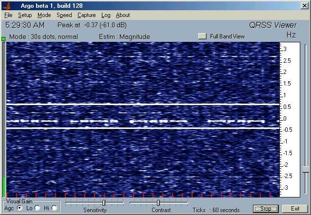 My simple single-turn loop has a fixed capacitor that tunes it to approximately 185 kHz, and the response is too far down to produce a usable signal in the 137 khz range. I was also unable to see XFX with my "poor man's" version of the AMRAD active whip antenna feeding the downconverter. There is a good possibility that the downconverter is being overloaded by out-of-band signals, since the active whip responds to everything from VLF through HF. I have also noticed that when I connect the active whip to my HP3586B selective level meter, I often get an "overload" LED indication even though the amplitude meter is not off scale. Someday I'll try a preselector on the output of the active whip to see if that fixes the problem. In the meantime, the tuned multiturn loop with its high-gain preamp works well into the software receiver, although it was necessary to crank the input gain pot on the downconverter almost all the way to zero. The screen captures below cover the same time frame, and show how the software receiver and Spectrum Lab compare to my IC-756PRO and Argo, using the same input signal. It looks like the software receiver was doing a better job than the "big rig", but if the Argo settings had been just right, I am sure that it would have produced as "clean" a screen capture as Spectrum Lab. The nice thing about Spectrum Lab's scrolling buffer is that I was able to travel back in time, so to speak, and fix the settings. Like a "morning after" birth control pill!