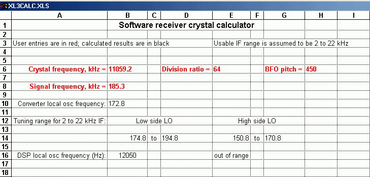 Crystal calculator spreadsheet -- A spreadsheet calculation is helpful for figuring out the local oscillator settings in Spectrum Lab, and for deciding which crystals in your junkbox might be usable in the downconverter. Here is a screenshot of a spreadsheet that I set up to do the routine arithmetic. I have also included a downloadable copy of the spreadsheet, called XL3CALC.XLS, which has been saved in Excel 3 format and which should work with later Excel versions as well.