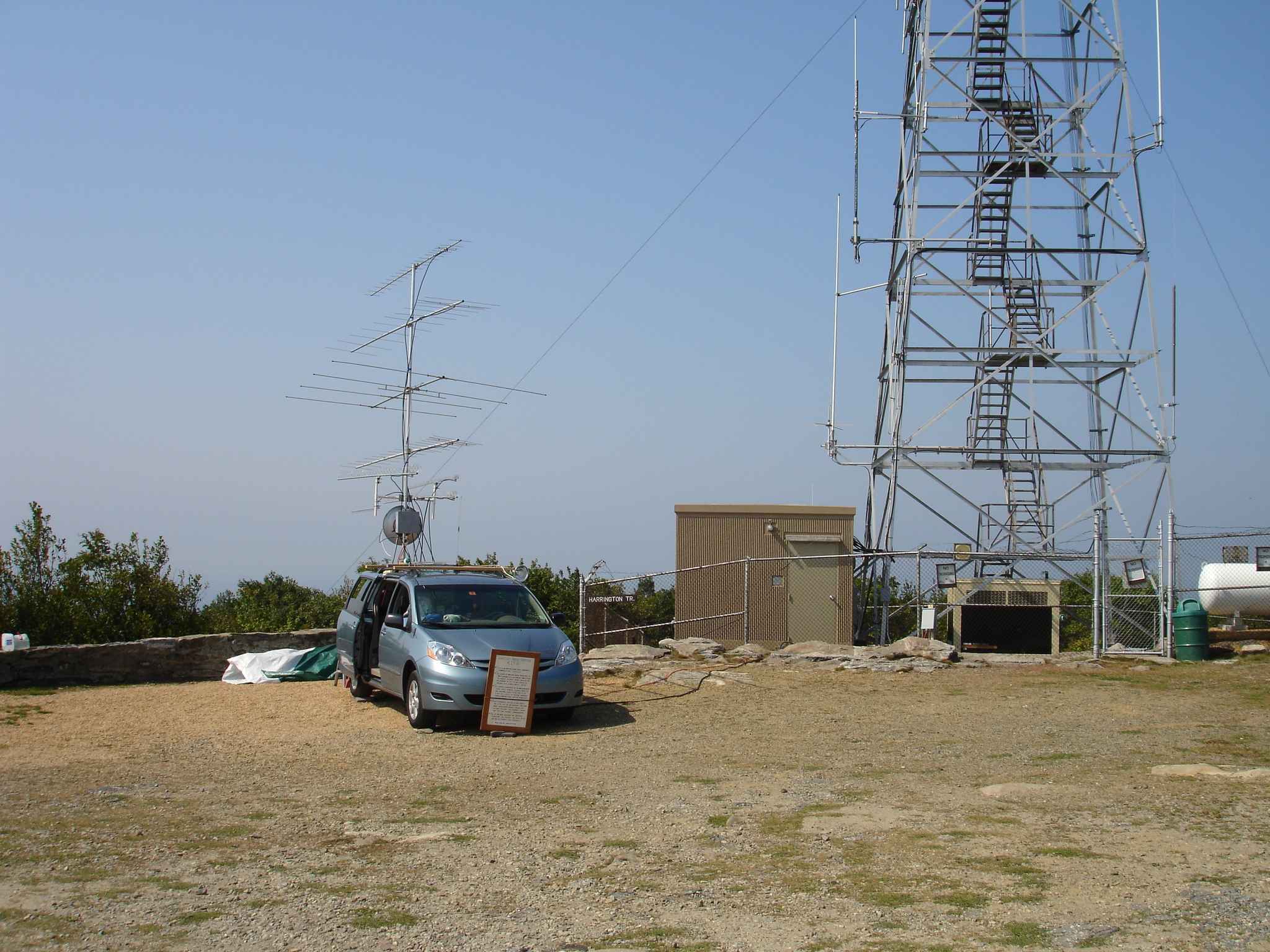 | Operating position at summit. looking west. | K1TR in a very hot shack | Antennas | The impressive, not so ergonomic, station layout |