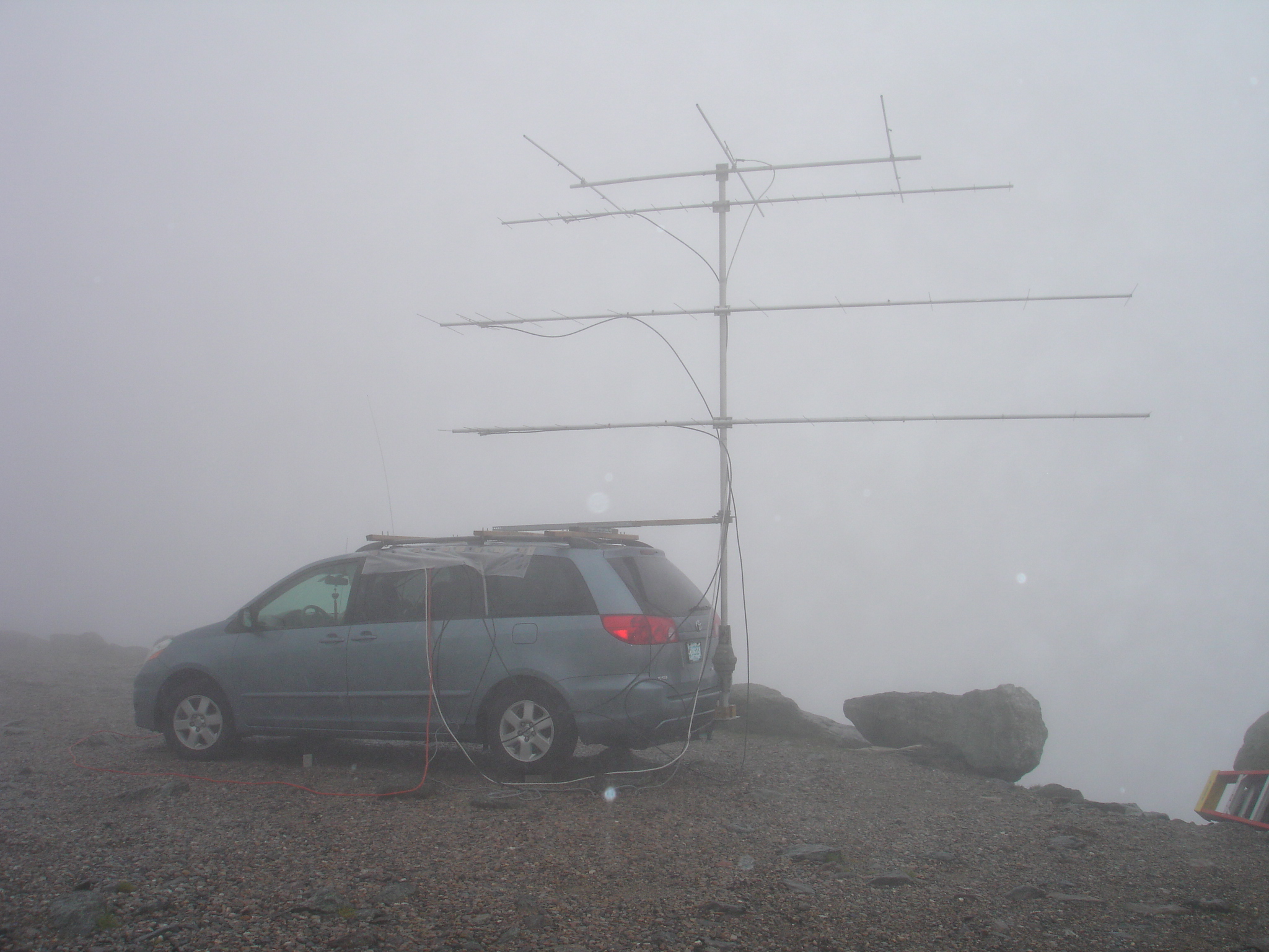 | The set up on Mt. Washington | So much fun setting up in the wind-blown rain. | The operating postion. | On Mt. Kearsarge on Sunday | KB1EKZ's super efficient rover set up on Mt. Kearsarge. |