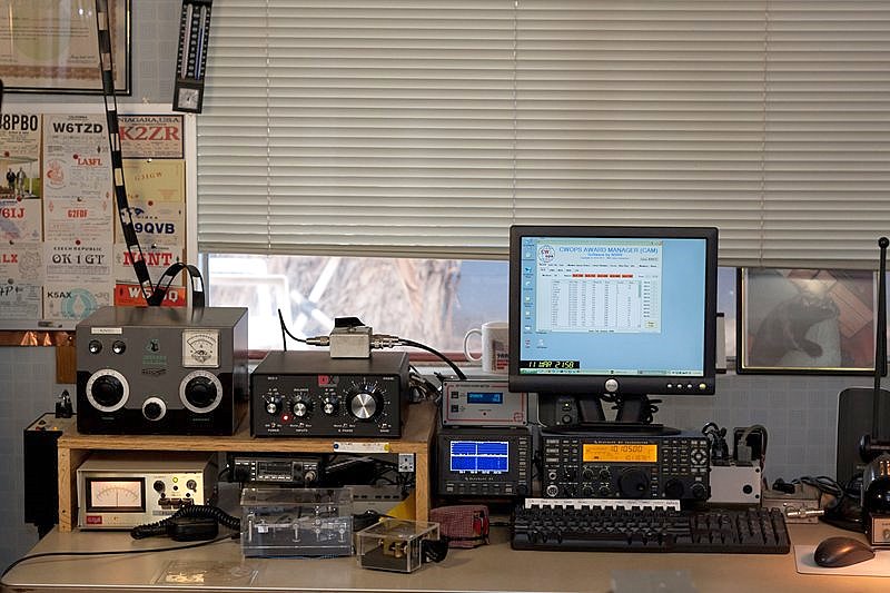 Equipment shown includes an Elecraft K3/100 transceiver and P3 Panadptor. There's also a DX Engineering NCC-1 Receive Antenna Variable Phasing Controller next to the old E. F. Johnson Matchbox antenna tuner. The NCC-1 was connected to two DXE active vertical receiving antennas, about 100' (30.5m) apart. Out of sight to the left are two amplifiers: a Kenwood TL-922 and my homebrew pair of 813's (see below). This photo was taken in 2011; since then, there have been numerous changes.